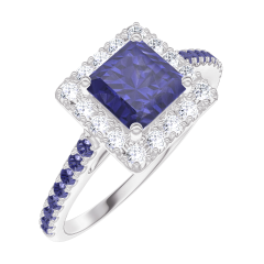 Ring Weißgold 750/-(18Kt) - Blauer Saphir Prinzess 0.5 Karat - Halo Diamant - Fassung Blauer Saphir