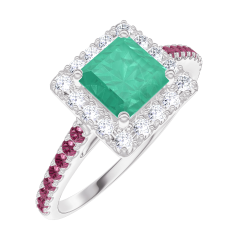 Ring Weißgold 375/-(9Kt) - Smaragd Prinzess 0.5 Karat - Halo Diamant - Fassung Rubin