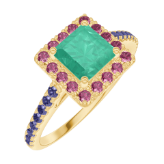 Ring Gelbgold 375/-(9Kt) - Smaragd Prinzess 0.5 Karat - Halo Rubin - Fassung Blauer Saphir