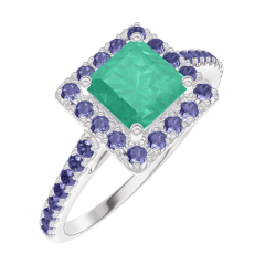 Ring Weißgold 375/-(9Kt) - Smaragd Prinzess 0.5 Karat - Halo Blauer Saphir - Fassung Blauer Saphir