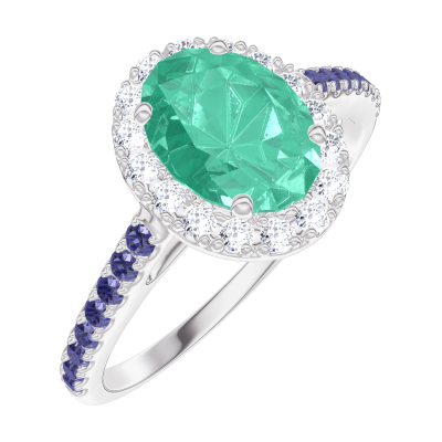« L'ATELIER » Nº171024Ring Weißgold 375/-(9Kt) - Smaragd Oval 0.5 Karat - Halo Diamant - Fassung Blauer Saphir 4.8