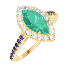 Ring Gelbgold 375/-(9Kt) - Smaragd Marquise 0.5 Karat - Halo Diamant - Fassung Blauer Saphir