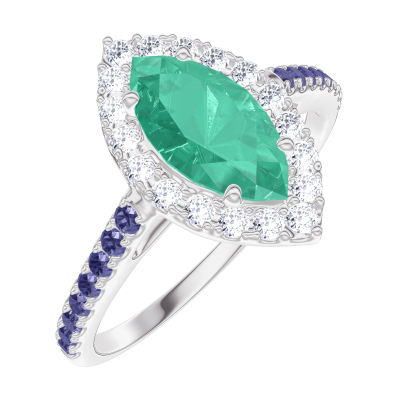 « L'ATELIER » Nº171120Ring Weißgold 375/-(9Kt) - Smaragd Marquise 0.5 Karat - Halo Diamant - Fassung Blauer Saphir