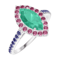 Ring Weißgold 750/-(18Kt) - Smaragd Marquise 0.5 Karat - Halo Rubin - Fassung Blauer Saphir