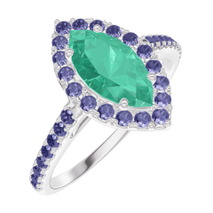 Ring Weißgold 375/-(9Kt) - Smaragd Marquise 0.5 Karat - Halo Blauer Saphir - Fassung Blauer Saphir