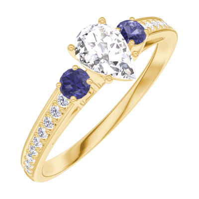 « L'ATELIER » Nº180466Ring Gelbgold 375/-(9Kt) - Labordiamant Tropfen 0.3 Karat - Seitliche Steine Blauer Saphir - Fassung Labordiamant