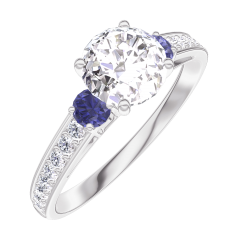 Ring Weißgold 375/-(9Kt) - Labordiamant rund 0.7 Karat - Seitliche Steine Blauer Saphir - Fassung Labordiamant