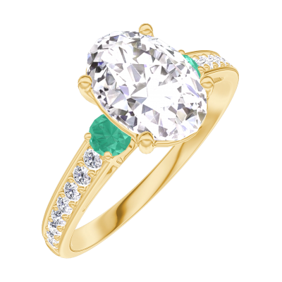 « L'ATELIER » Nº187586Ring Gelbgold 375/-(9Kt) - Labordiamant Oval 1 Karat - Seitliche Steine Smaragd - Fassung Labordiamant 4.8