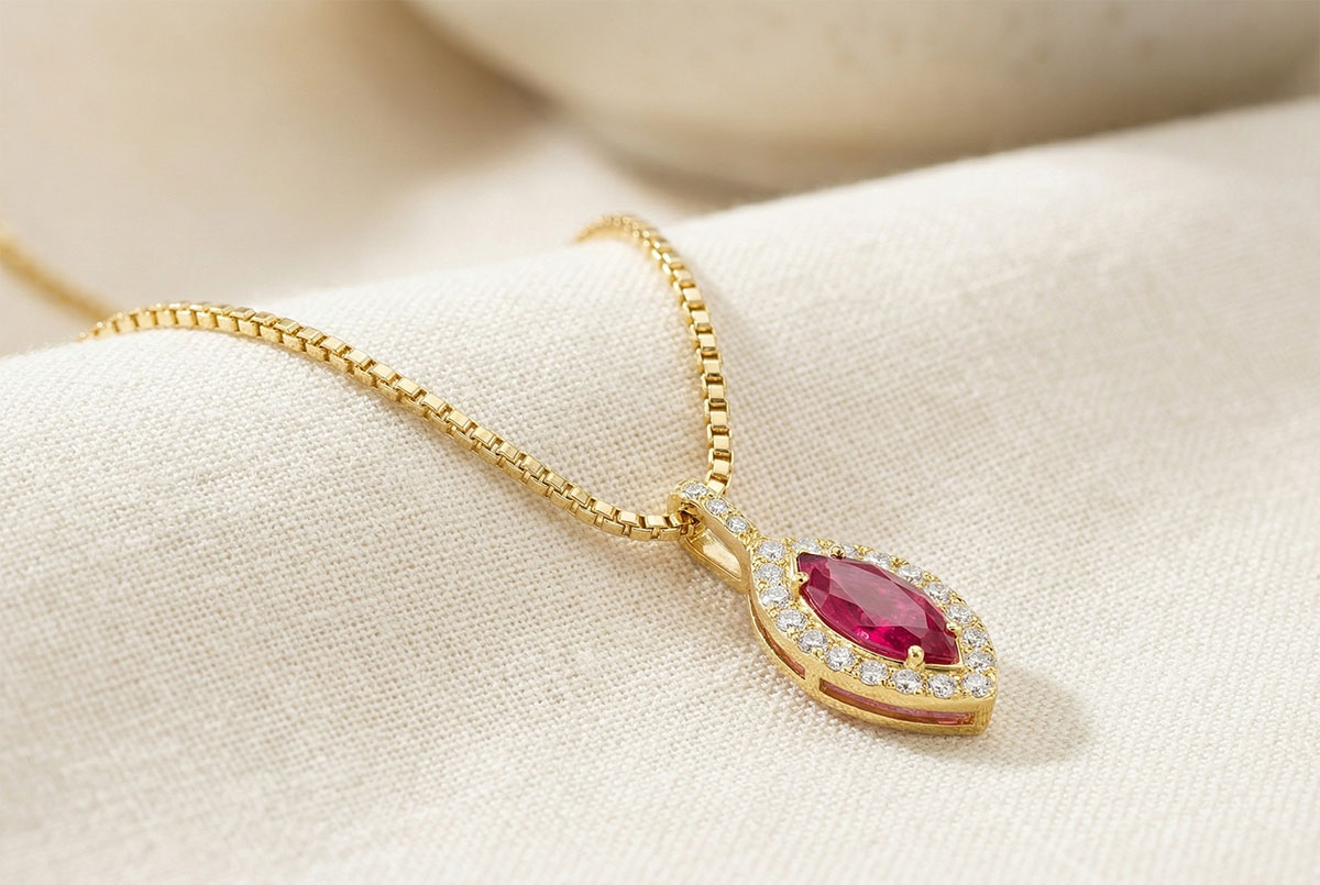 « L'ATELIER » NR. 205750Anhänger Gelbgold 375/-(9Kt) - Rubin Marquise 0.3 Karat - Halo Diamant - Fassung Diamant - Kette Venezianerkette