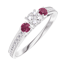 Ring Weißgold 375/-(9Kt) - Pavé aus natürlichen Diamanten rund entsprechend 0.3 - Seitliche Steine Rubin - Fassung Diamant
