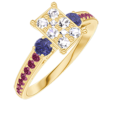 Ring Gelbgold 750/-(18Kt) - Pavé aus natürlichen Diamanten Rechteckig entsprechend 0.7 - Seitliche Steine Blauer Saphir - Fassung Rubin