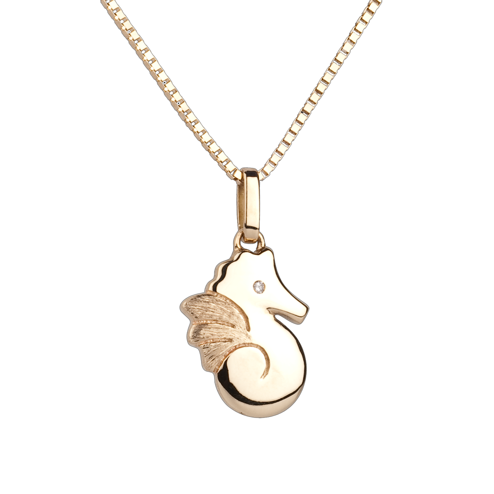 Ein kleines Seepferdchen in Gelbgold blinzelt verschmitzt mit einem strahlenden Diamantäuglein. Großes Modell. Ohne Kette. 1 Diamant : 0.05 Karat - Gelbgold (375/-): 0.9 g. Weitere Abmessungen