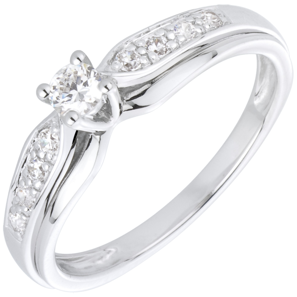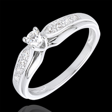 Ein Solitär wird an beiden Seiten von mit Diamanten besetztem Weißgold mit strukturierter Oberfläche emporgehoben. 9 Diamanten : 0.24 Karat - Weißgold (750/-): 2.6 g. Weitere Abmessungen