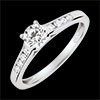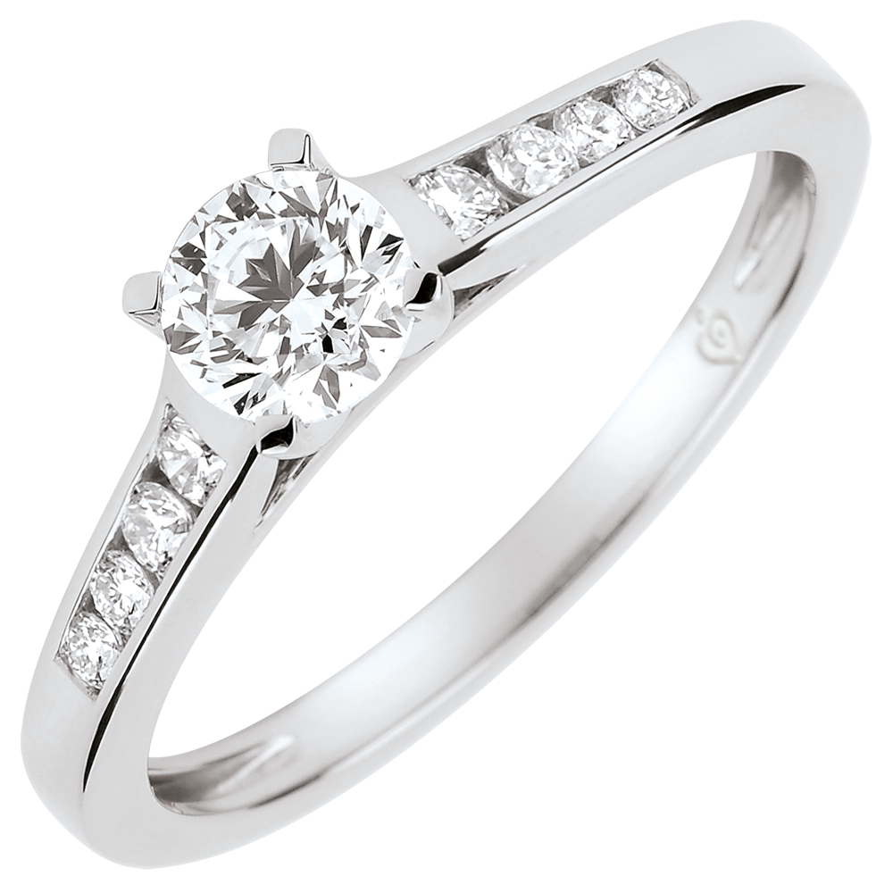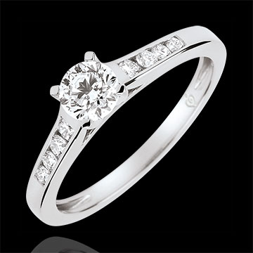 Ein unentbehrlicher Solitaire aus Weißgold, unterstrichen mit einer Reihe von Brillanten, in einer klaren, zarten und zeitlosen Fassung. Zentraler Stein 0,4 Karat. 9 Diamanten : 0.56 Karat - Weißgold (750/-): 2.2 g. Weitere Abmessungen