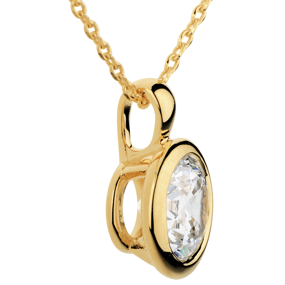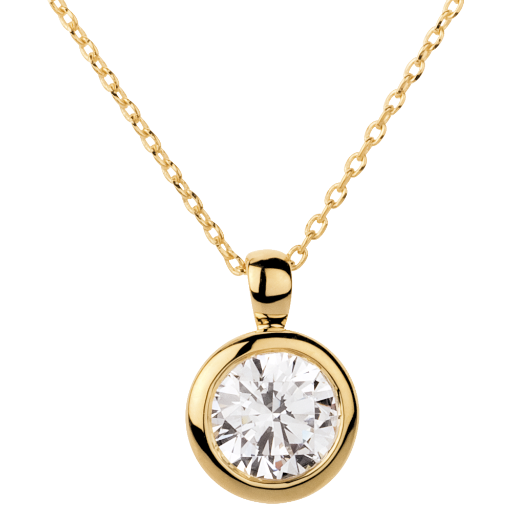 Ein dezent funkelnder Solitärdiamant im Schutze einer feinen Fassung aus Gelbgold. Mit Kette 42 cm + Verlängerung von 3 cm; 750/-. 1 Diamant : 2 Karat - Gelbgold (750/-): 5.3 g. Weitere Abmessungen