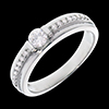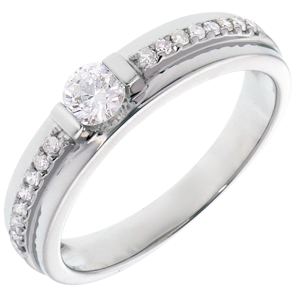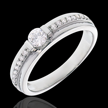 Ein zentraler Diamant posiert auf einer breiten Krone, welche selbst von vielen kleinen Diamanten gesäumt wird. Die aufwendige Fassung dieses Ringes, macht ihn zu einem außergewöhnlichen Modell, von zeitloser Eleganz. 17 Diamanten : 0.34 Karat - Weißgold (750/-): 4 g. Weitere Abmessungen