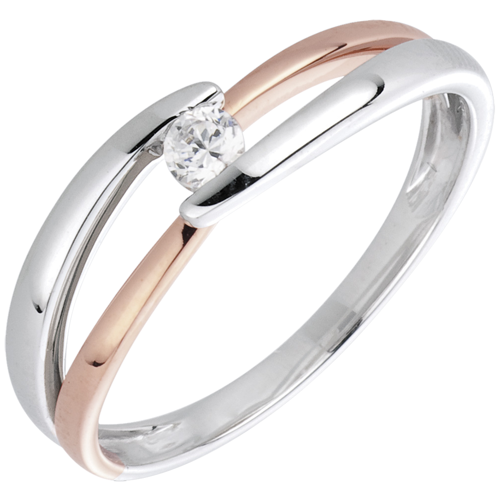 Ein Solitärdiamant wird auf elegante Weise von vier Gliedern, jeweils zwei in Rosé- und zwei in Weißgold, gehalten und bildet auf diese Weise einen originellen und zugleich eleganten Ring. 1 Diamant: 0.10 Karat - Roségold (18 kt = 750/1000): 2.20 Gramm.