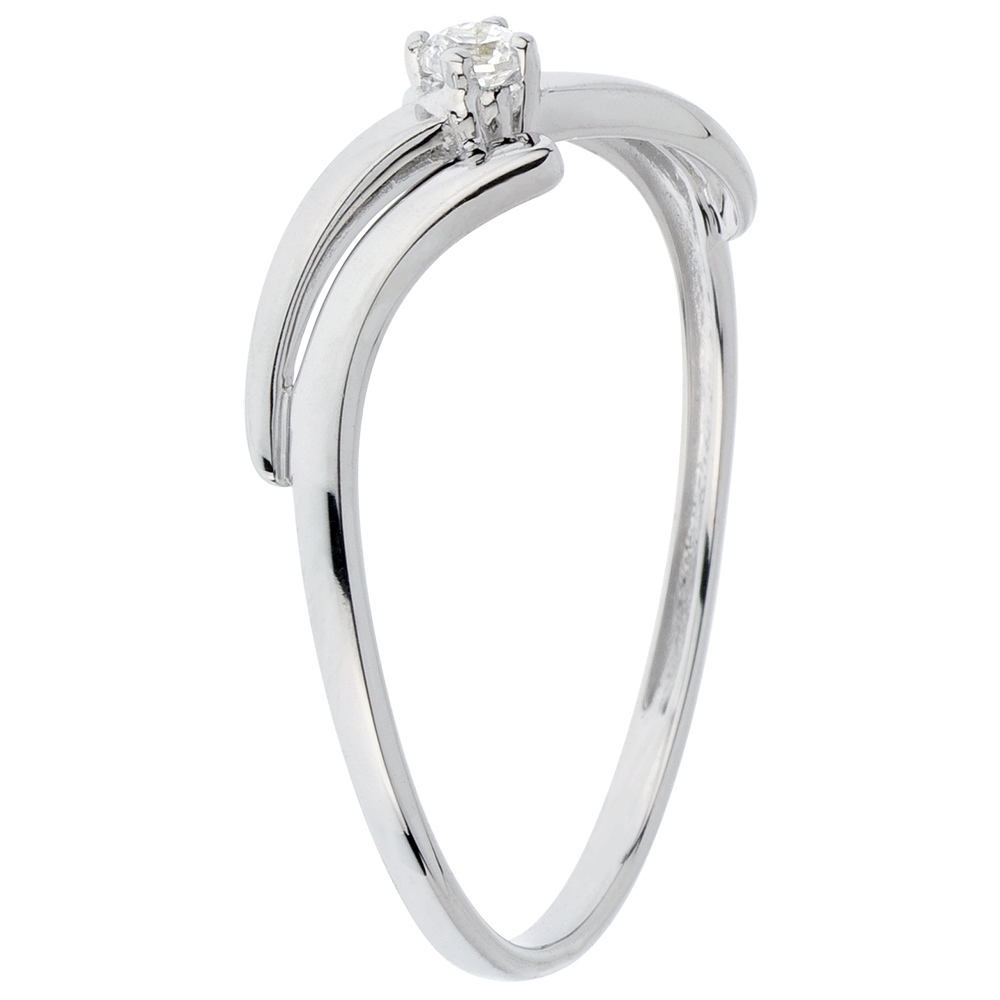 Ein von Weißgold umgebener Diamant in einer 4er Krappenfassung inmitten einer dynamischen Montur aus Weißgold