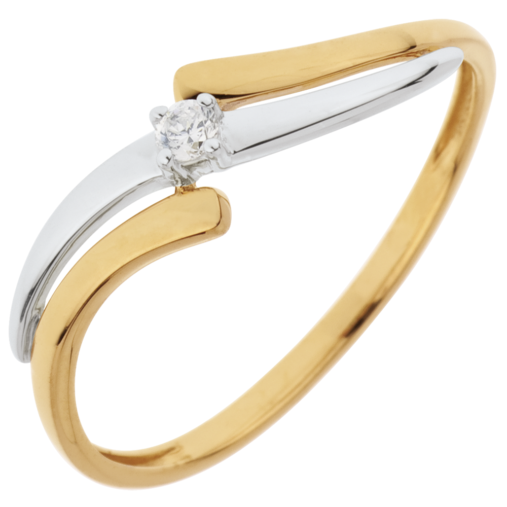 Ein von Weißgold umgebener Diamant in einer 4er Krappenfassung inmitten einer dynamischen Montur aus Weiß- und Gelbgold.