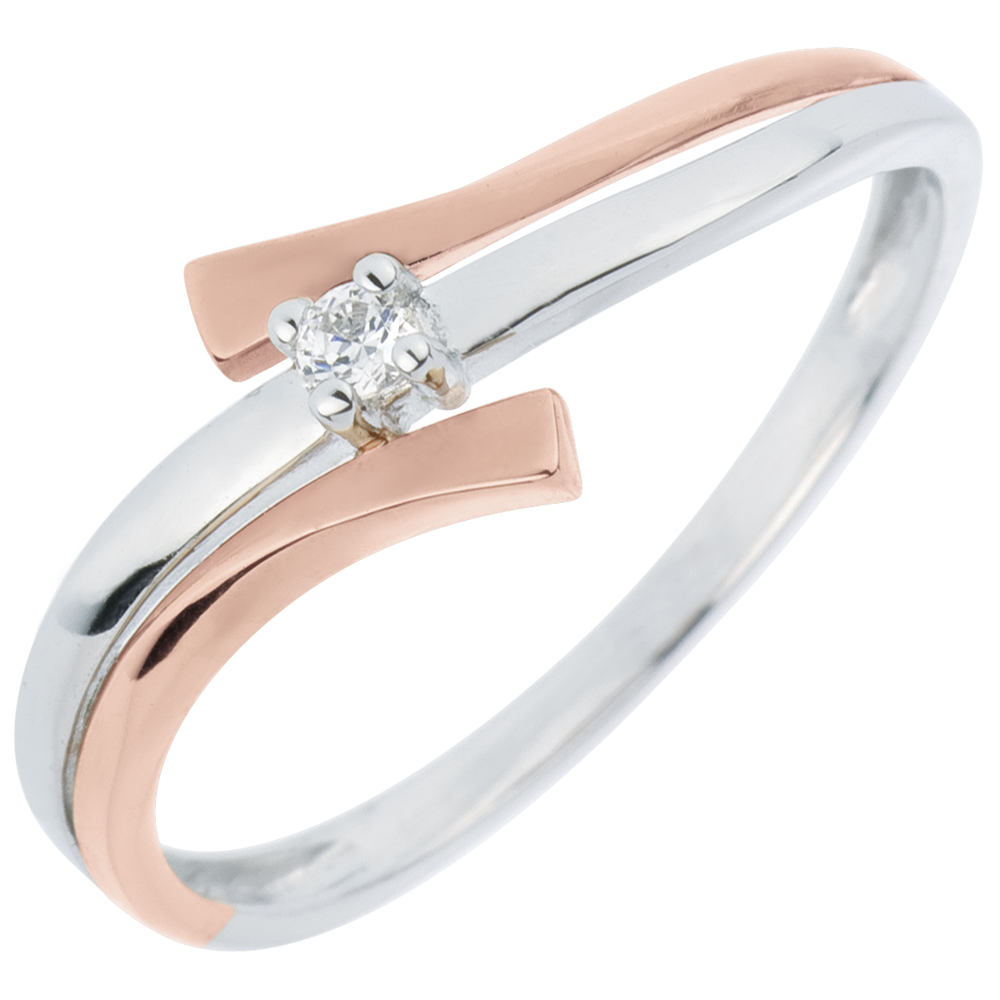 Ein erlesener Diamant wird sorgfältig von vier Krappen in Weißgold gehalten und posiert auf einer dynamischen Fassung in Weiß- und Roségold.