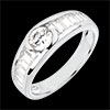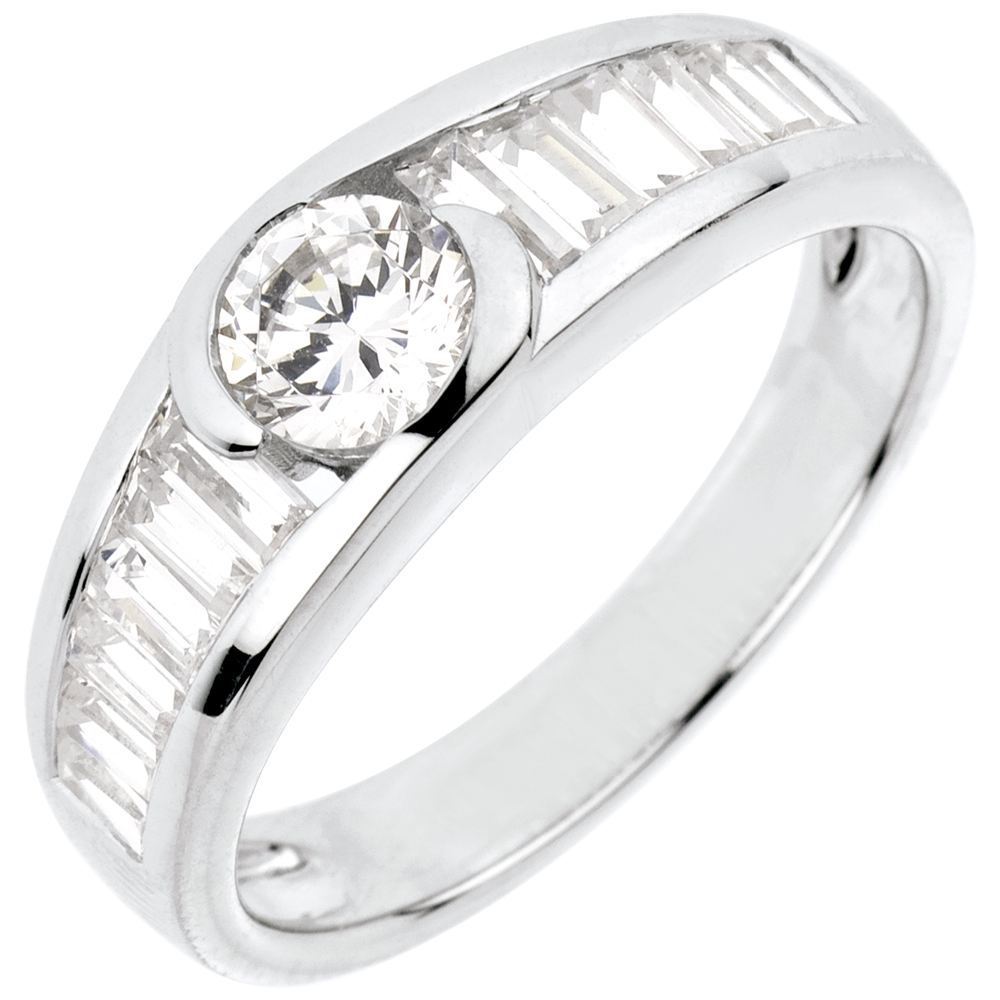 Dieser Solitärdiamant ruht in einer prächtigen Fassung, welche von erlesenen Diamanten mit Baguetteschliff begleitet wird. 11 Diamanten : 1.08 Karat - Weißgold (750/-): 4.6 g. Weitere Abmessungen