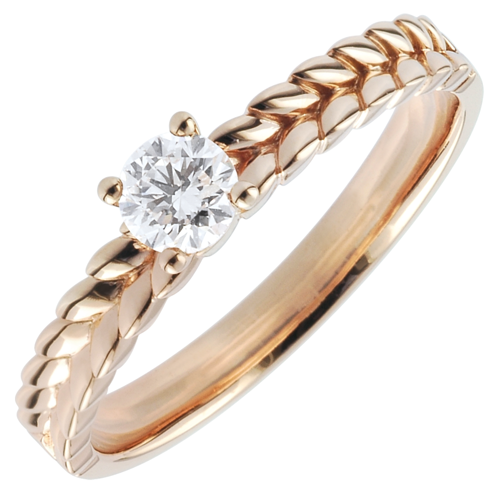 Ein Solitärdiamant, sorgfältig von vier Krappen gefasst, posiert auf einem Ring, der an zart geflochtes Blattwerk erinnert - Ein origineller und raffinierter Verlobungsring. 1 Diamant : 0.2 Karat - Rotgold (750/-): 2.7 g. Weitere Abmessungen