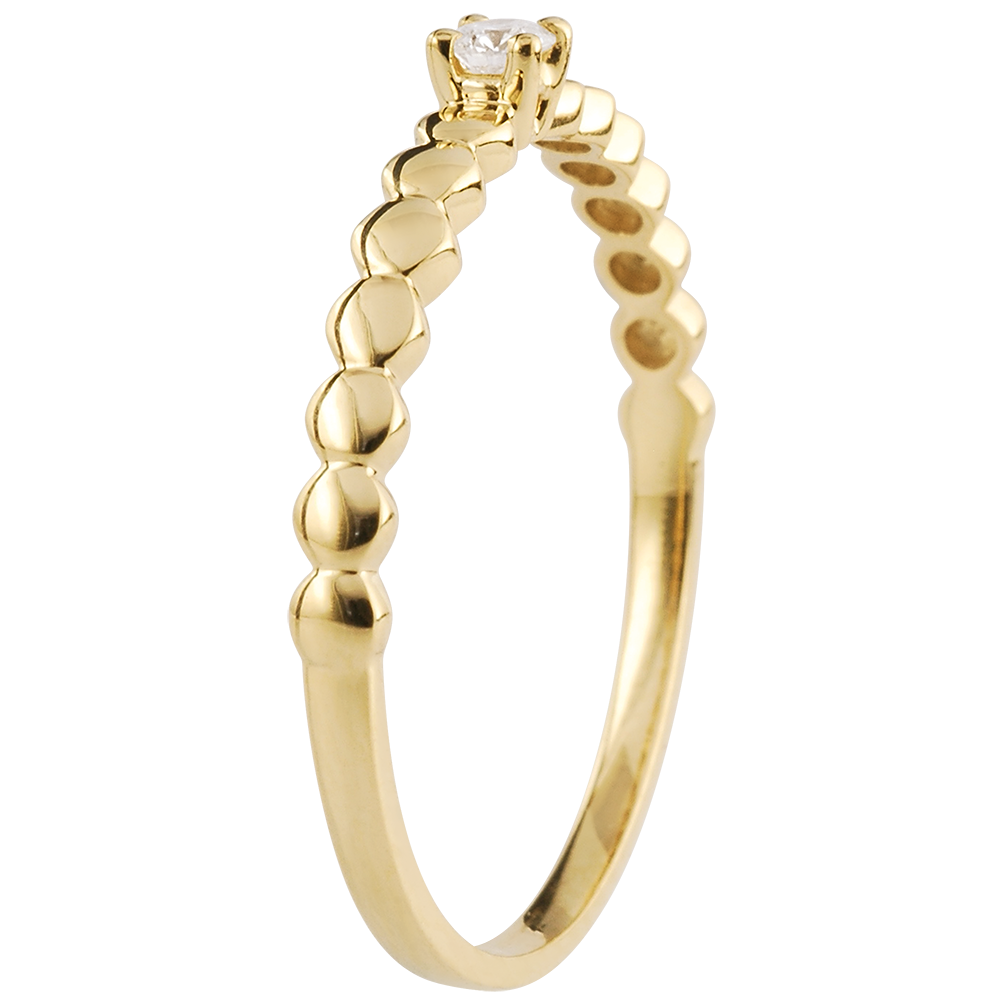 Eine Fassung wie kleine Bonbons in Gelbgold trägt einen Solitär in 4er Krappenfassung. Ein origineller und femininer Verlobungsring. 1 Diamant : 0.05 Karat - Gelbgold (750/-): 1.2 g. Weitere Abmessungen
