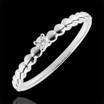Eine Fassung wie kleine Bonbons in Weißgold trägt einen Solitär in 4er Krappenfassung. Ein origineller und femininer Verlobungsring.