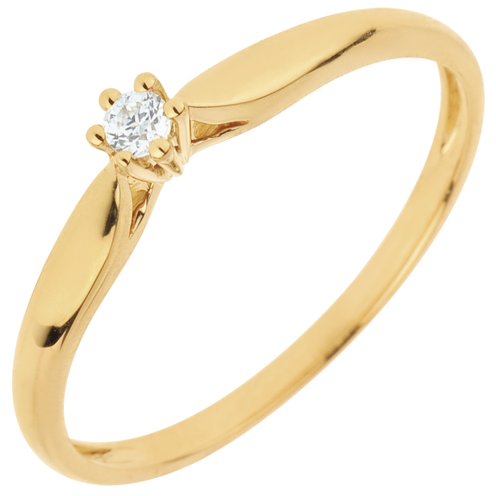 Ein Ring zart wie Schilfgras, gekrönt von einem Diamant in einer 6er Krappenfassung. 1 Diamant : 0.05 Karat - Gelbgold (750/-): 1.1 g. Weitere Abmessungen