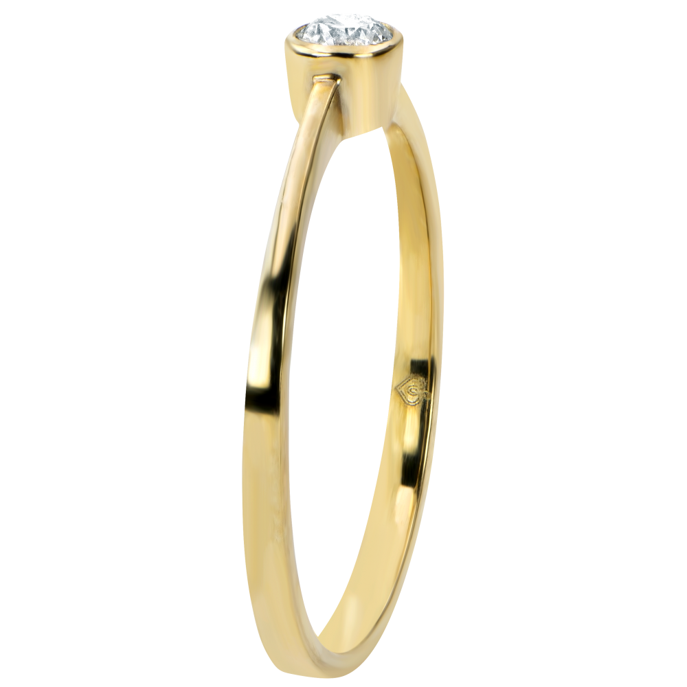 Ein eckiger Ring, gekrönt von einem Diamanten in Zargenfassung, welche einen perfekten Lichteinfall und auf diese Weise eine reine Brillanz des Steins ermöglicht.