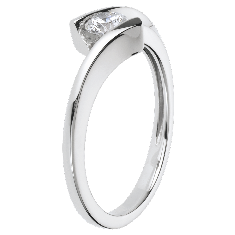 Ein glitzernder Diamant wird gehalten von einer elegant geschwungenen Fassung aus Weissgold.