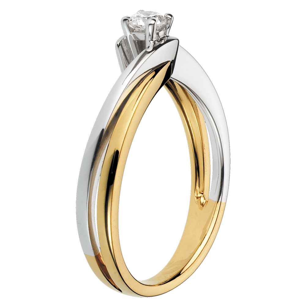 Ein dezent strahlender Diamant krönt diese originelle Fassung aus zwei Goldfarben. Ein edler Ring, der Lebendigkeit ausstrahlt.