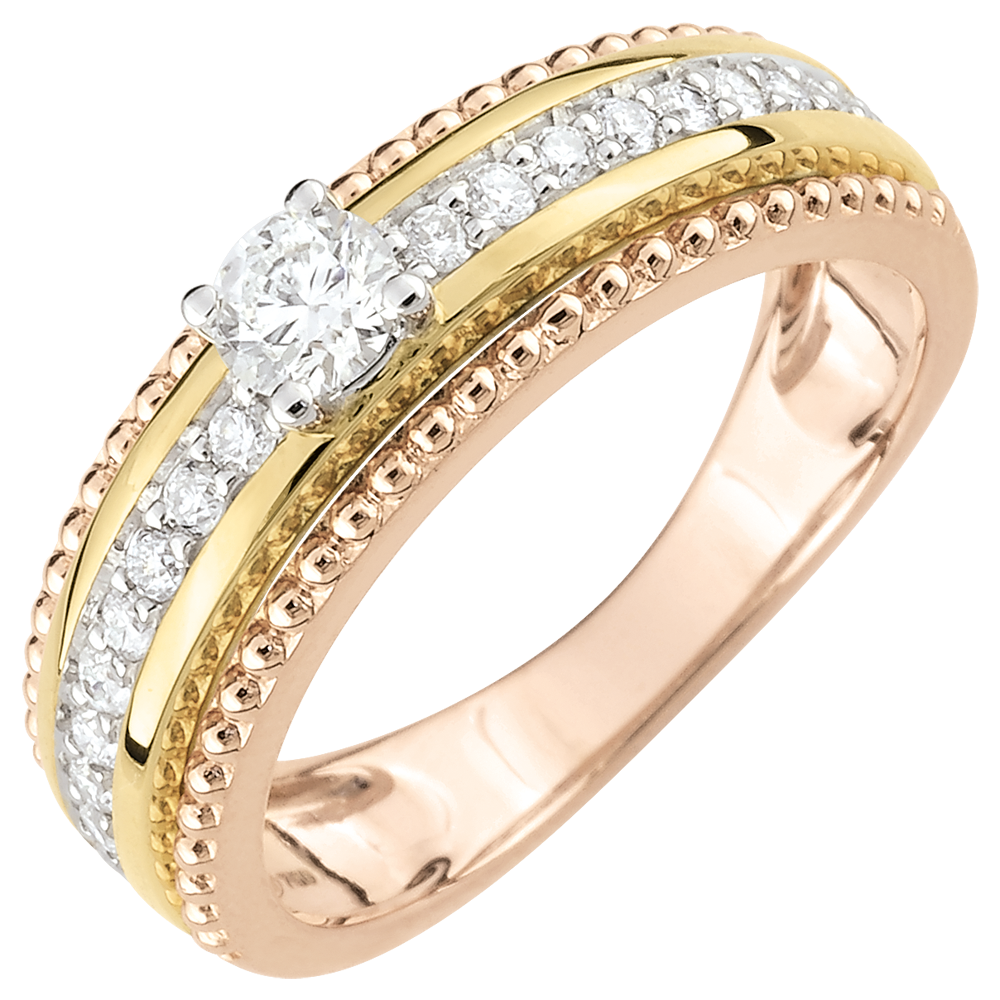 Ein erlesener Solitärdiamant wird von zwei Reihen Goldperlen getragen, die in ihrer Mitte einen Diamantring bergen. Dieser Ring in dreierlei Gold trägt seine Weiblichkeit auf glänzende Art und Weise zur Schau. 19 Diamanten : 0.38 Karat - Tricolor (375/-): 3.5 g. Weitere Abmessungen