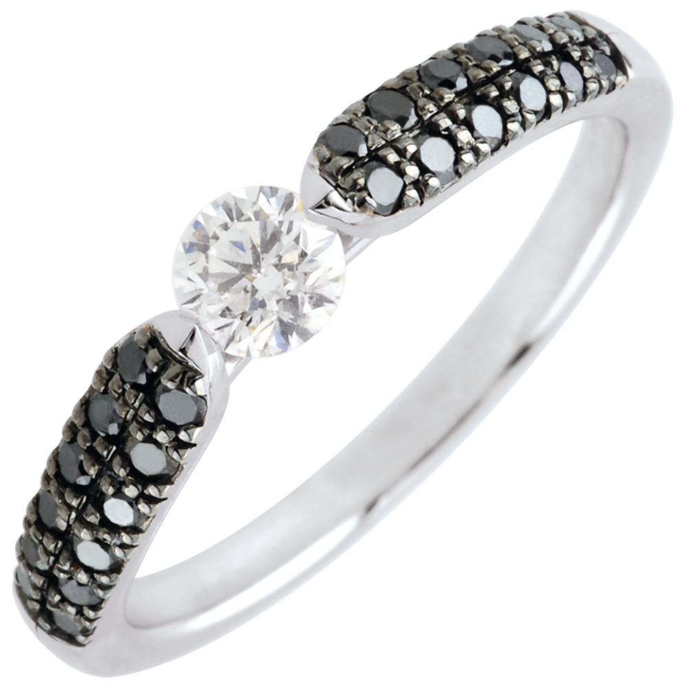 Ein überwältigender umrandeter Solitär, verbindet schwarze Diamanten mit Weißgold. Ein modernes Schmuckstück.