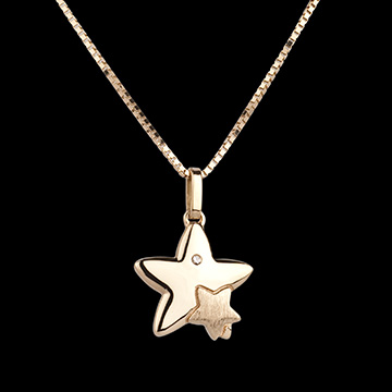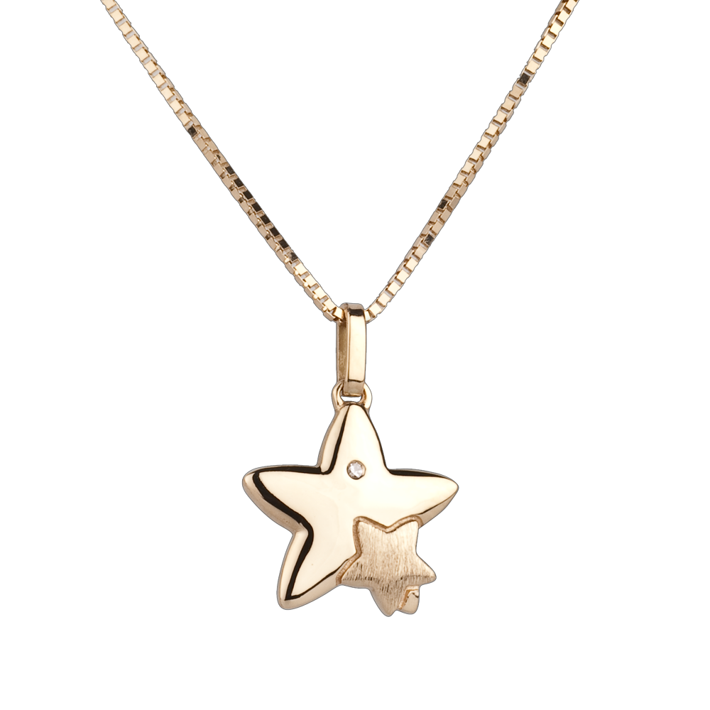 Ein großer Stern umarmt seinen kleinen Schützling. Ein Diamant verziert einen seiner gelbgoldenen Spitzen. Großes Modell.