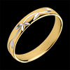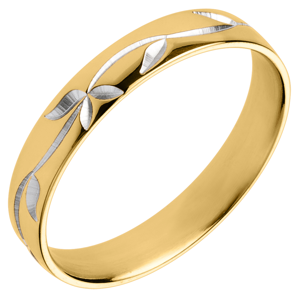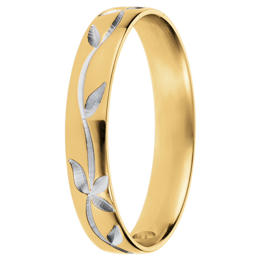 Ein gelbgoldener Trauring, welcher von zartem Blattwerk in Weißgold geprägt ist.