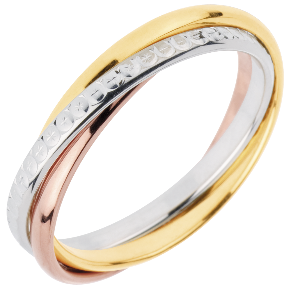 Ein Ring in Weißgold mit diamantartiger Oberfläche, ein Zweiter in Gelb- und ein Dritter Roségold vereinen sich für die Ewigkeit. Tricolor (750/-): 5.2 g. Weitere Abmessungen