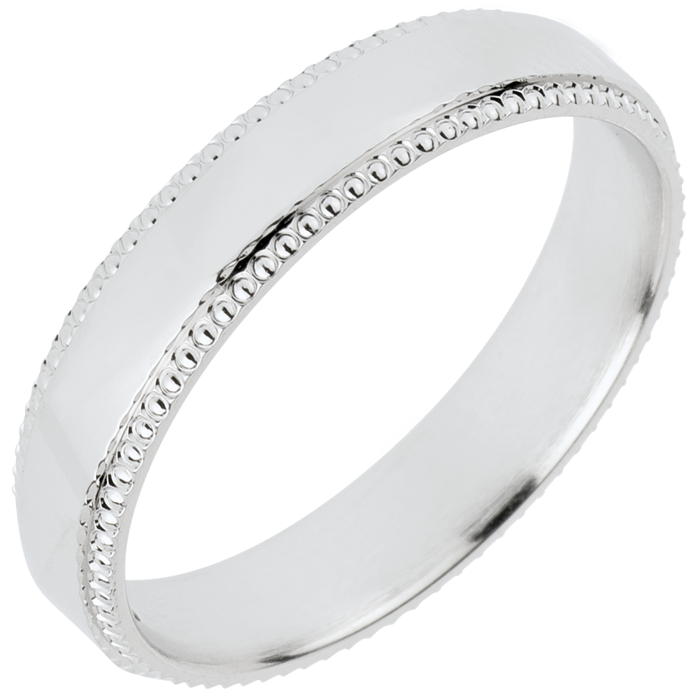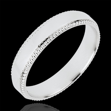 Ein Trauring aus Weißgold mit einer Prägung für ein hohes Maß an Brillanz.