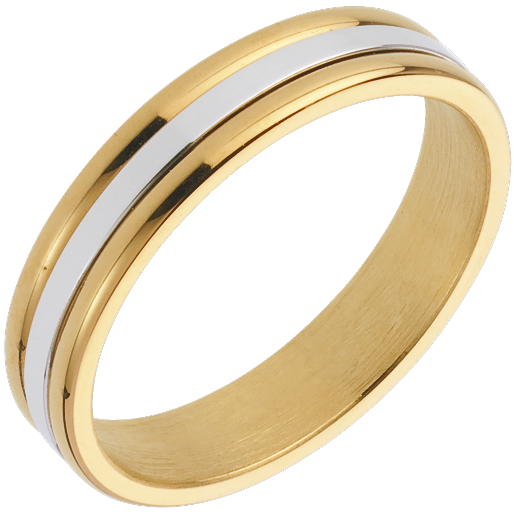 Ein Trauring aus Gelbgold, schlicht und originell zugleich, verziert mit einem Bogen aus Weissgold in der Mitte. Weiß-und Gelbgold (750/-): 3.9 g. Weitere Abmessungen