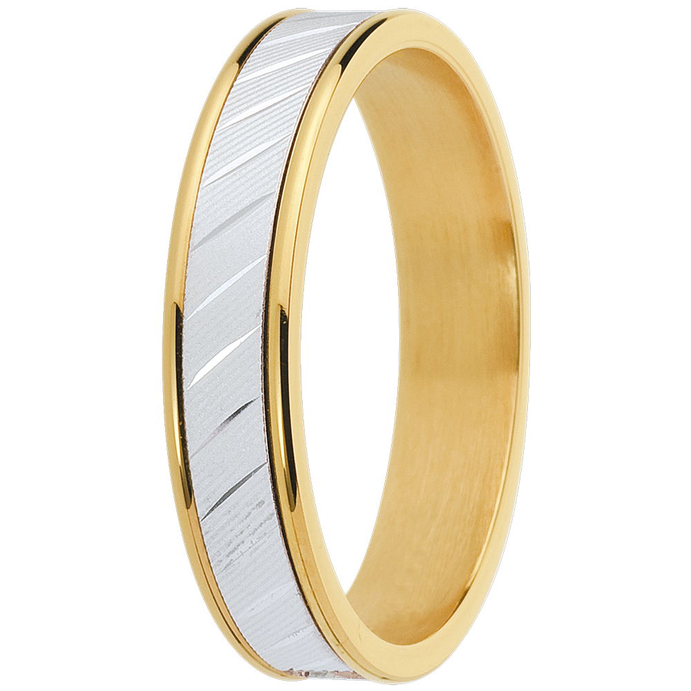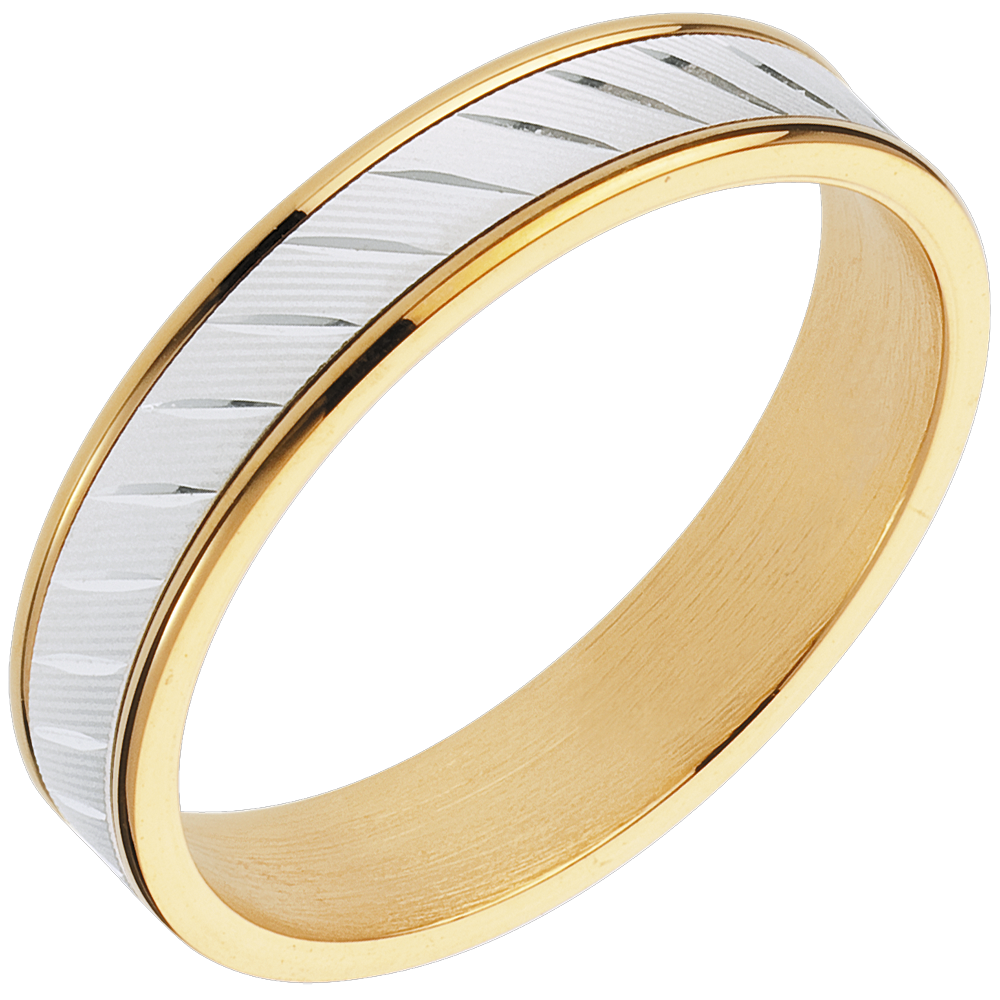 Ein Trauring aus Gelbgold, schlicht und originell zugleich, mit einem kunstvoll verzierten Bogen aus Weissgold in der Mitte. Weiß-und Gelbgold (750/-): 5 g. Weitere Abmessungen