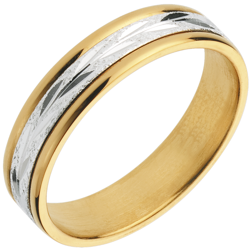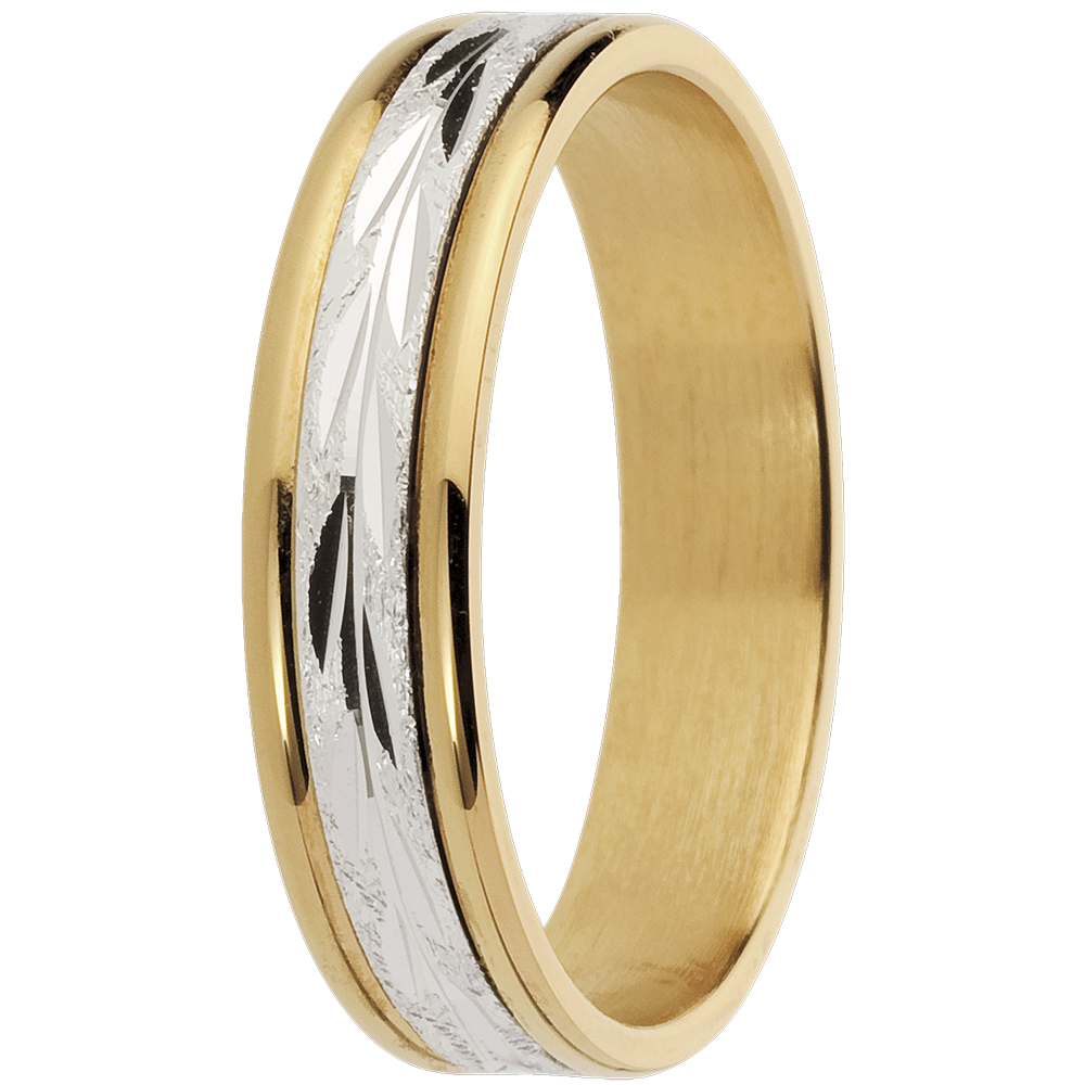 Ein schlichter und origineller Trauring aus Gelbgold geschmückt von einem weißgoldenen Bogen mit Blattmustern. Weiß-und Gelbgold (750/-): 5.2 g. Weitere Abmessungen