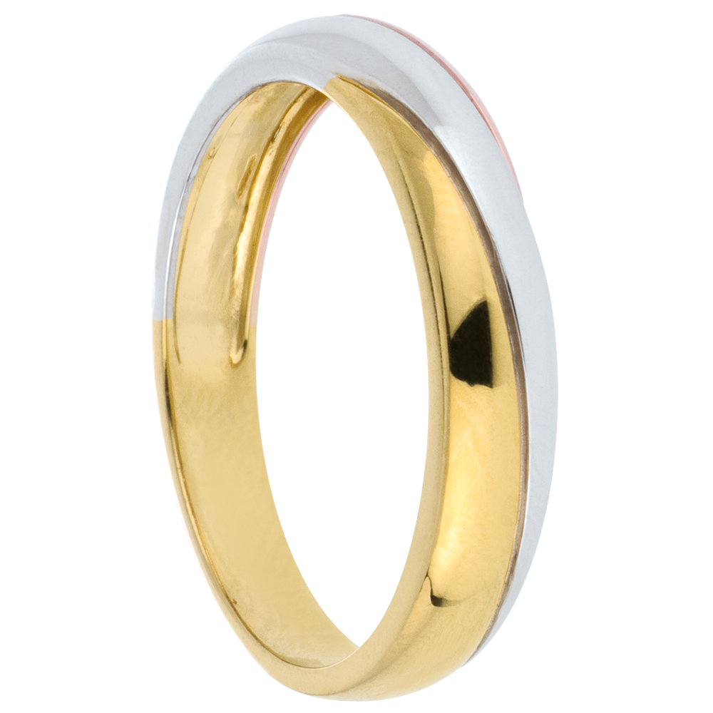 Eleganz und Schönheit sind die wohl zutreffendsten Eigenschaften dieses beständigen Traurings in dreierlei Gold. Tricolor (750/-): 2.7 g. Weitere Abmessungen