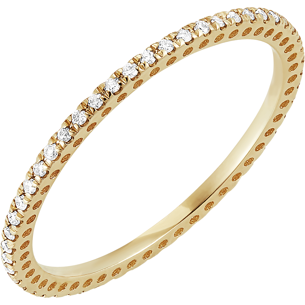 Ein dünner, zarter Ring aus Gelbgold, rundum mit Diamanten besetzt. Dieser Trauring kann gut zu einem Verlobungsring oder auch alleine getragen werden. 52 Diamanten : 0.2 Karat - Gelbgold (750/-): 0.9 g. Weitere Abmessungen