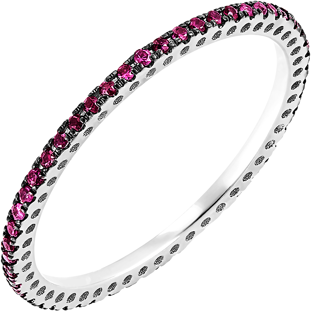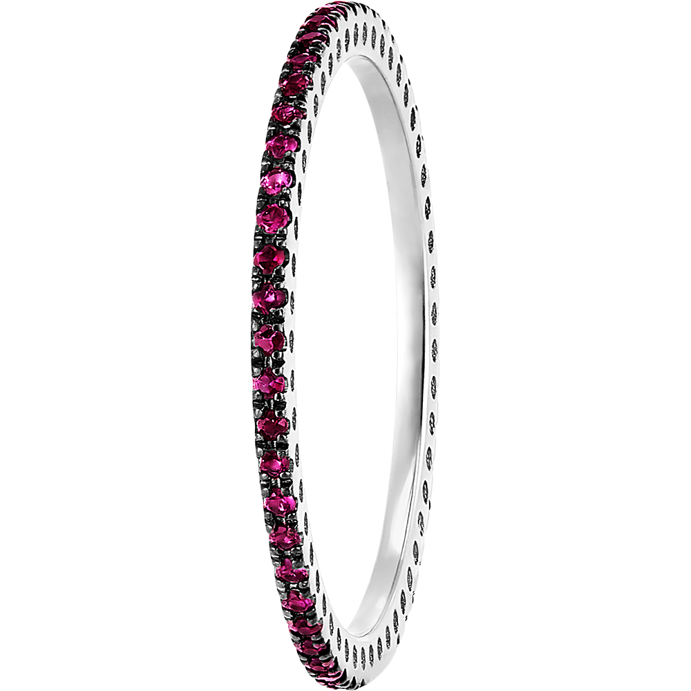 Ein dünner, zarter Ring aus Weißgold, rundum mit Rubinen besetzt. Dieser Trauring kann gut zu einem Verlobungsring oder auch alleine getragen werden.