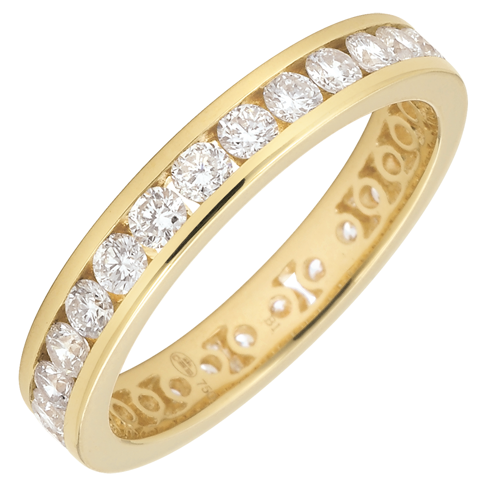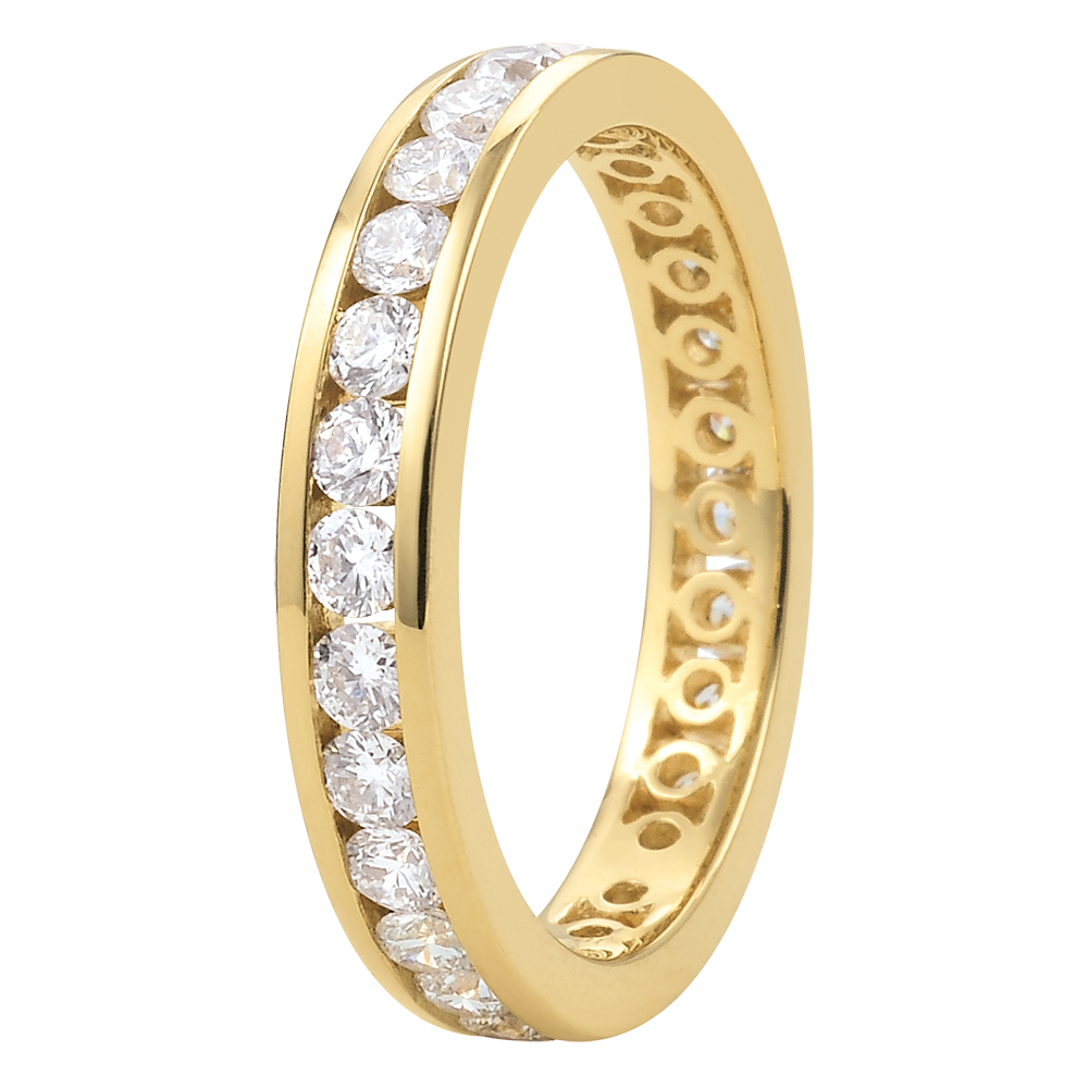 Dieser Trauring verkörpert das perfekte Zusammenspiel eines gelbgoldenen Ringes, welcher mit rundgeschliffenen Diamanten in Kanalfassung besetzt ist. Dieses Schmuckstück steht symbolisch für ein außergewöhnliche und beständige Verbindung.