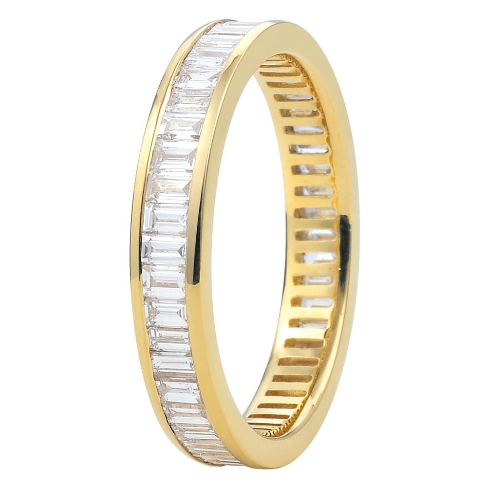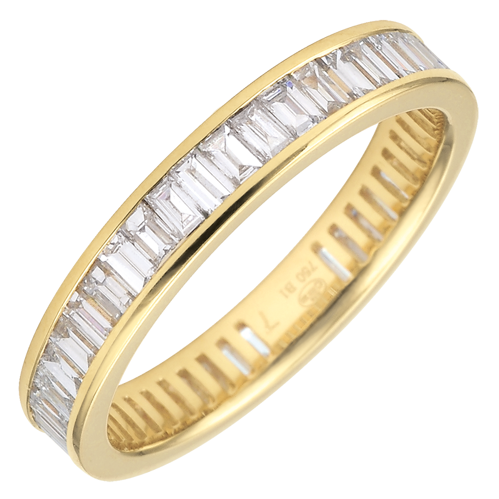 Dieser Trauring verkörpert das perfekte Zusammenspiel eines gelbgoldenen Ringes, welcher mit erlesenen Baguettediamanten in Kanalfassung besetzt ist. Dieses Schmuckstück steht symbolisch für ein außergewöhnliche und beständige Verbindung. 50 Diamanten : 1.22 Karat - Gelbgold (750/-): 2.2 g. Weitere Abmessungen