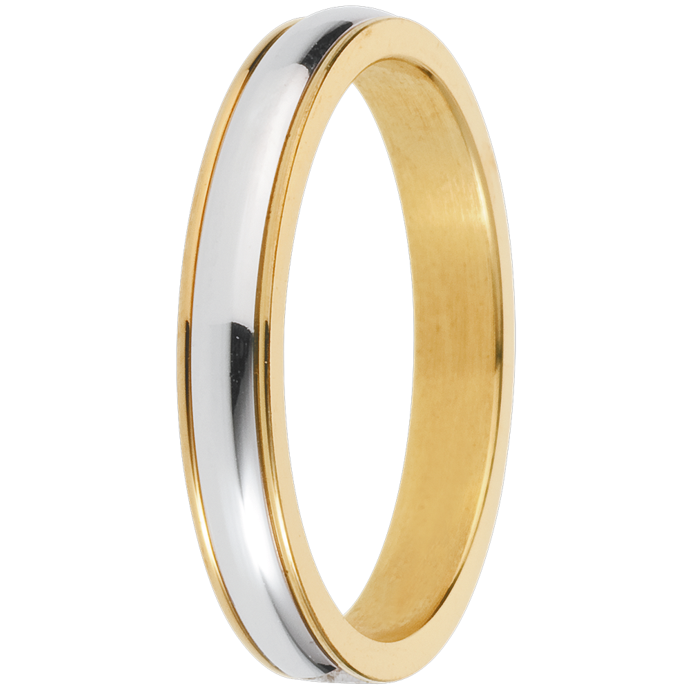Ein schlichter Weissgoldring in ewiger Umarmung mit zwei schmalen Ringen aus Gelbgold.