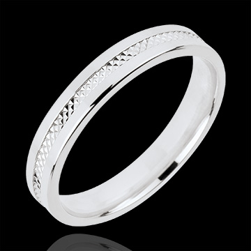 Ein Trauring aus Weißgold mit mittiger Prägung für ein Maximum an Brillanz.