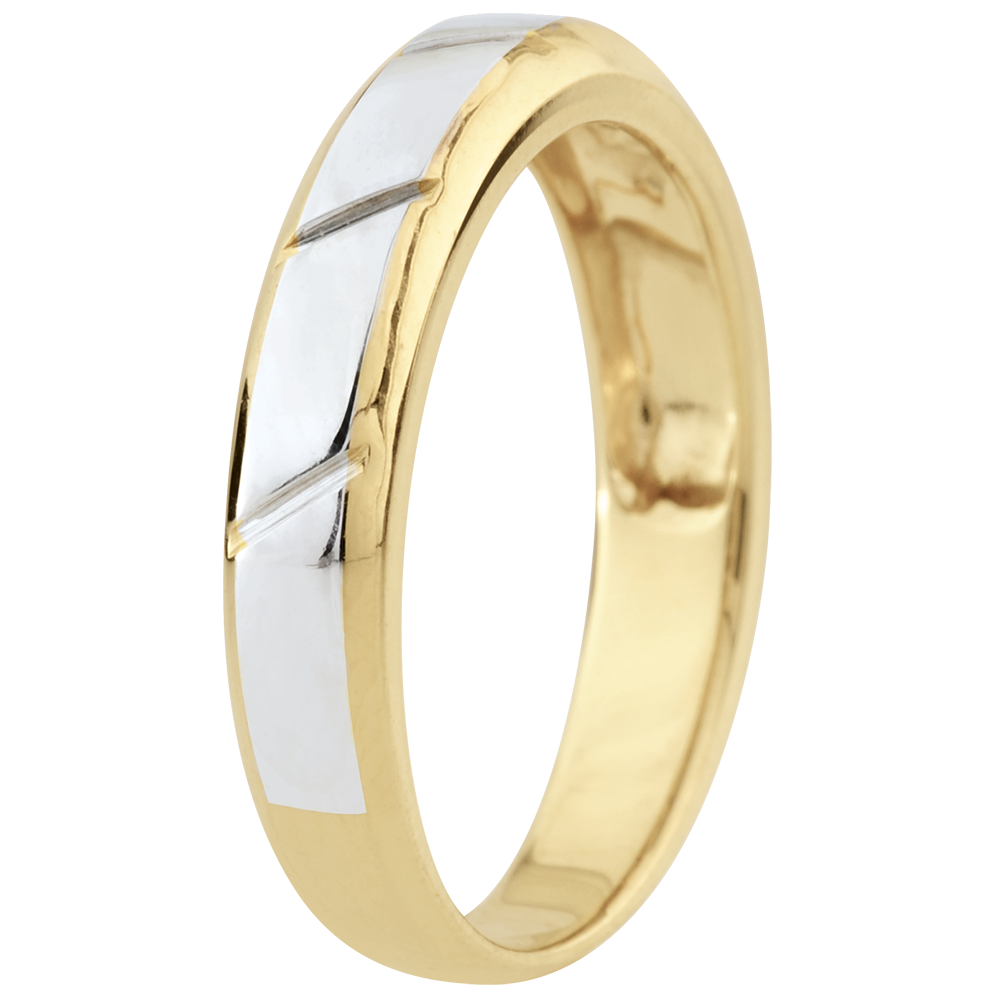 Ein Trauring aus Gelbgold an den Seiten abgeschrägt, versehen mit einem geriffelten Band aus Weißgold