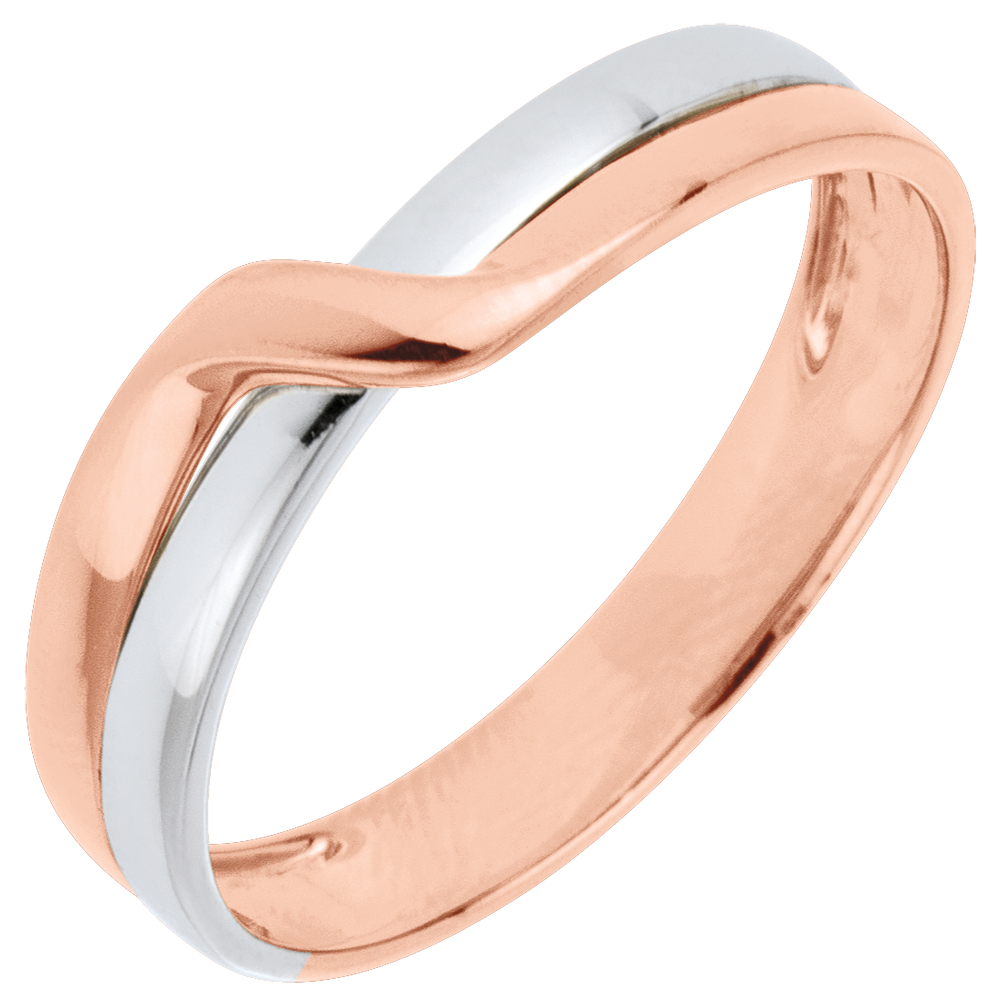 Ein Band aus Weißgold leidenschaftlich umschlungen von einem Streifen aus Roségold.